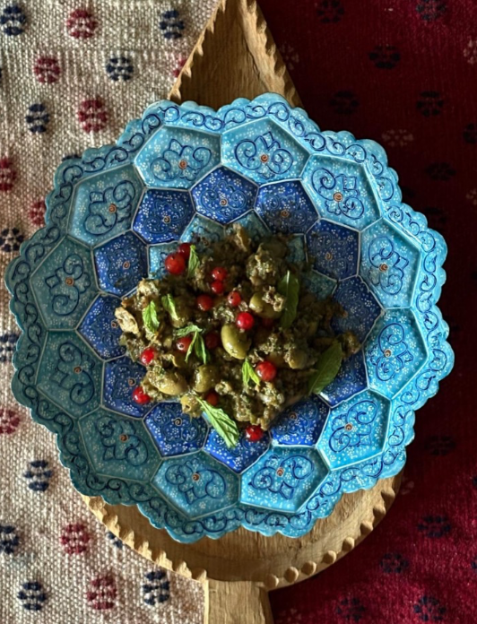 Apéro raffiné, héritage d’Iran — le caviar végétal, notre zeyton parvardeh, symbole d’élégance et de partage.